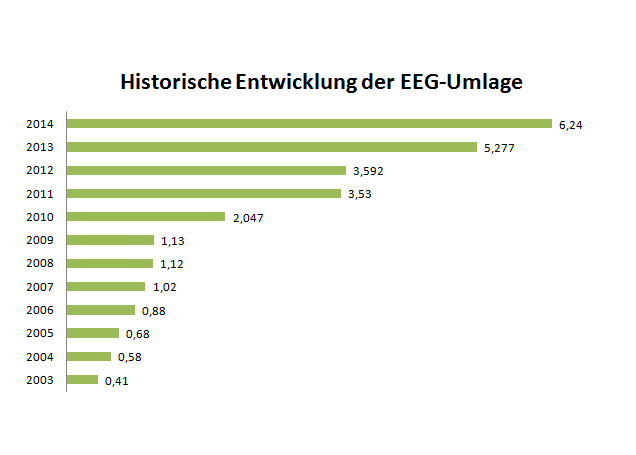 Die EEG-Umlage steigt im Jahr 2014 um knapp 1 Cent und damit um etwa 20%. Der eigentliche Zubau im Jahr 2014 nur ca. 0,20 Cent aus. Weitere Faktoren sind die Ausnahmeregelungen für energieintensive Unternehmen, die ca. 0,35 Cent betragen. Der (durch die erneuerbaren Energien) stark gesunkene Börsenpreis und die Liquiditätsreserve tun ihr Übriges.